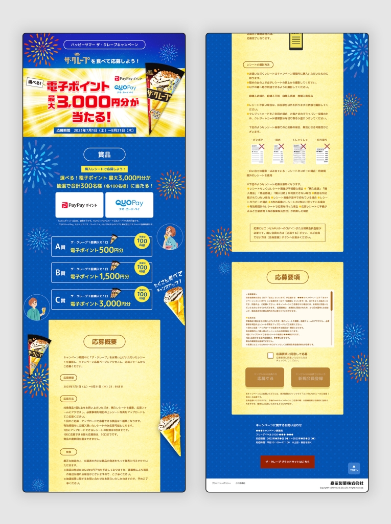 デザイン/コーディング 賞品まわりをインパクトがあるデザインにしました。 夏のキャンペーンなので、全体に花火を散りばめ賑やかに見せました。 URL https://web.fish-owl.biz/ice/the_crepe/happysummer タイプ LP キャンペーンサイト テイスト ポップ 業種 食品・飲料 森永ホットケーキミックス×しろくまちゃんのほっとけーき キャンペーン2023前の記事 森永製菓 手づくりクッキー生地 ブランドサイト次の記事