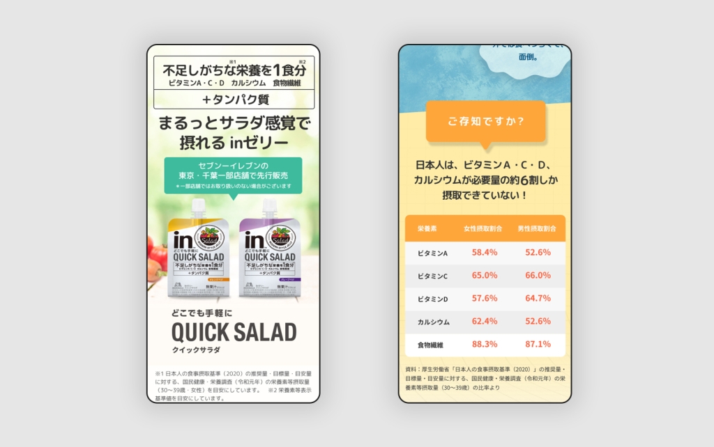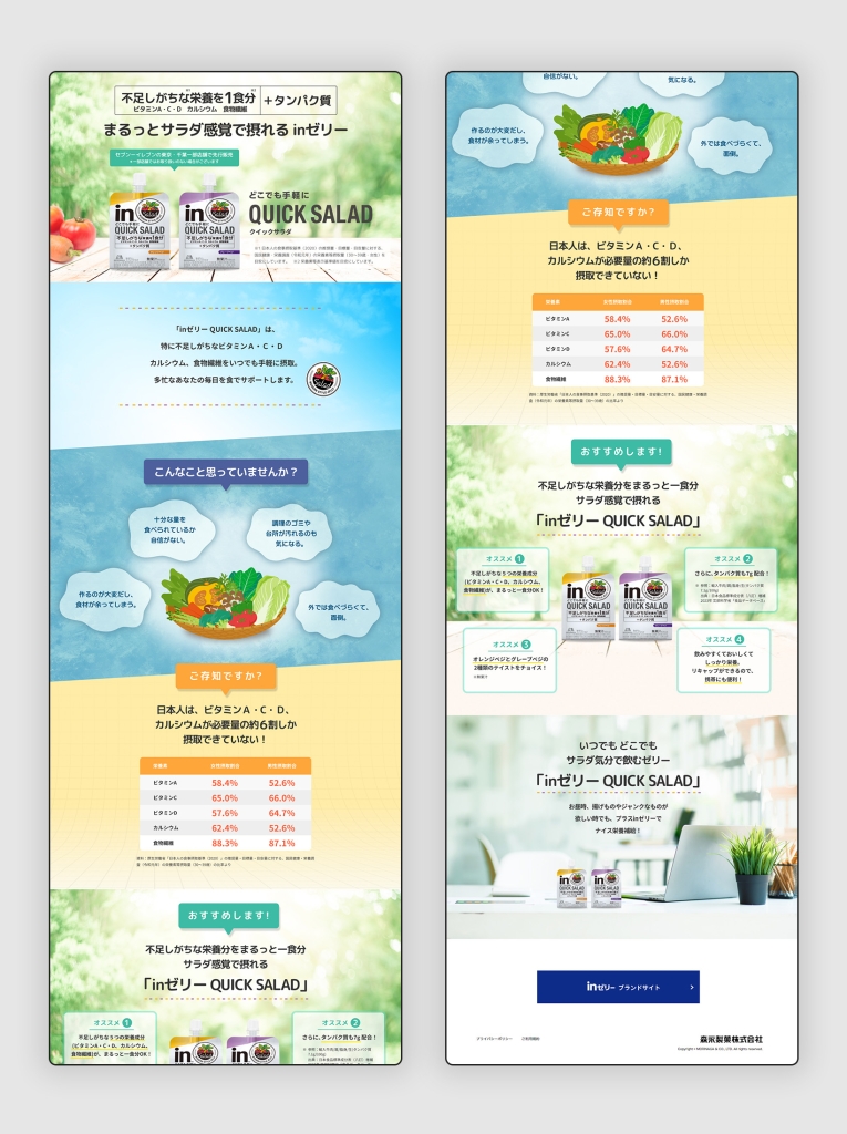デザイン/コーディング 全体的に明るく、爽やかでスタイリッシュなデザインにしました。 URL https://www.morinaga.co.jp/in/jelly/products/quick_salad/ タイプ LP ブランドサイト テイスト シンプル スタイリッシュ ナチュラル 業種 食品・飲料 森永ホットケーキミックス×しろくまちゃんのほっとけーき キャンペーン2024前の記事 森永製菓 inゼリー 完全栄養 ブランドサイト次の記事